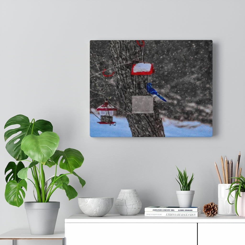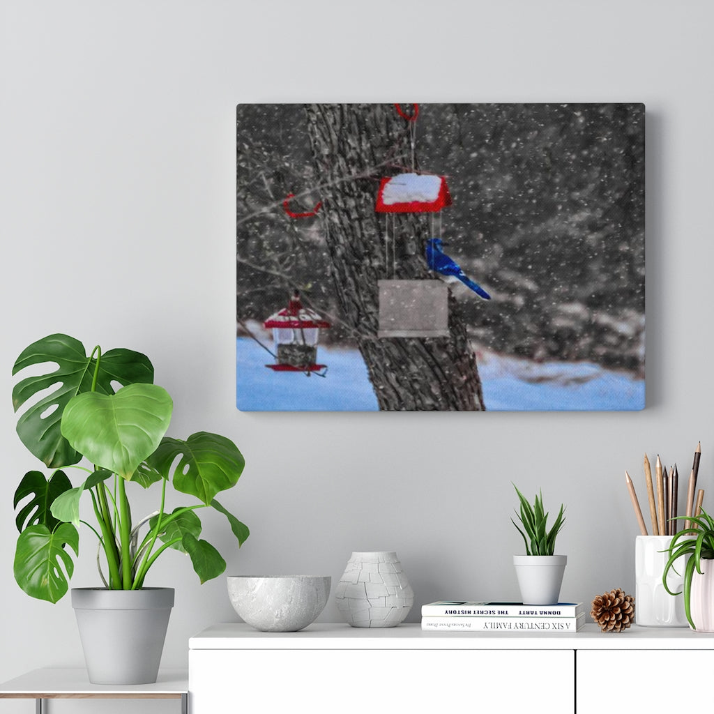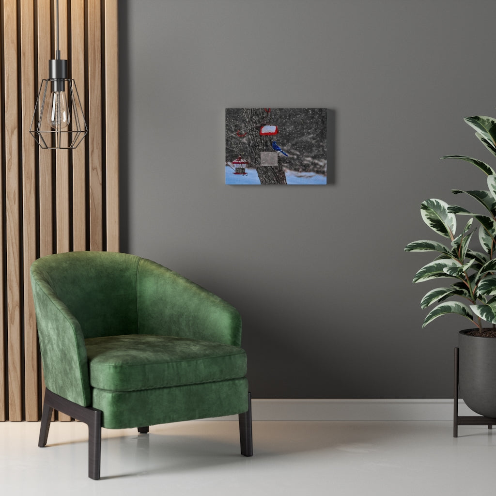 Featuring the photo of a male Blue Jay on a snow day in McDonough, NY, this custom stretched canvas print is made from treated cotton - providing the smoothest of matte surfaces for exceptional design vividity. A combination of quality and durability, these hangings come with a lifelong color guarantee; there's significant confidence in their withstanding the test of time. On the backside, pre-installed hanging hardware ensures proper locking to walls.